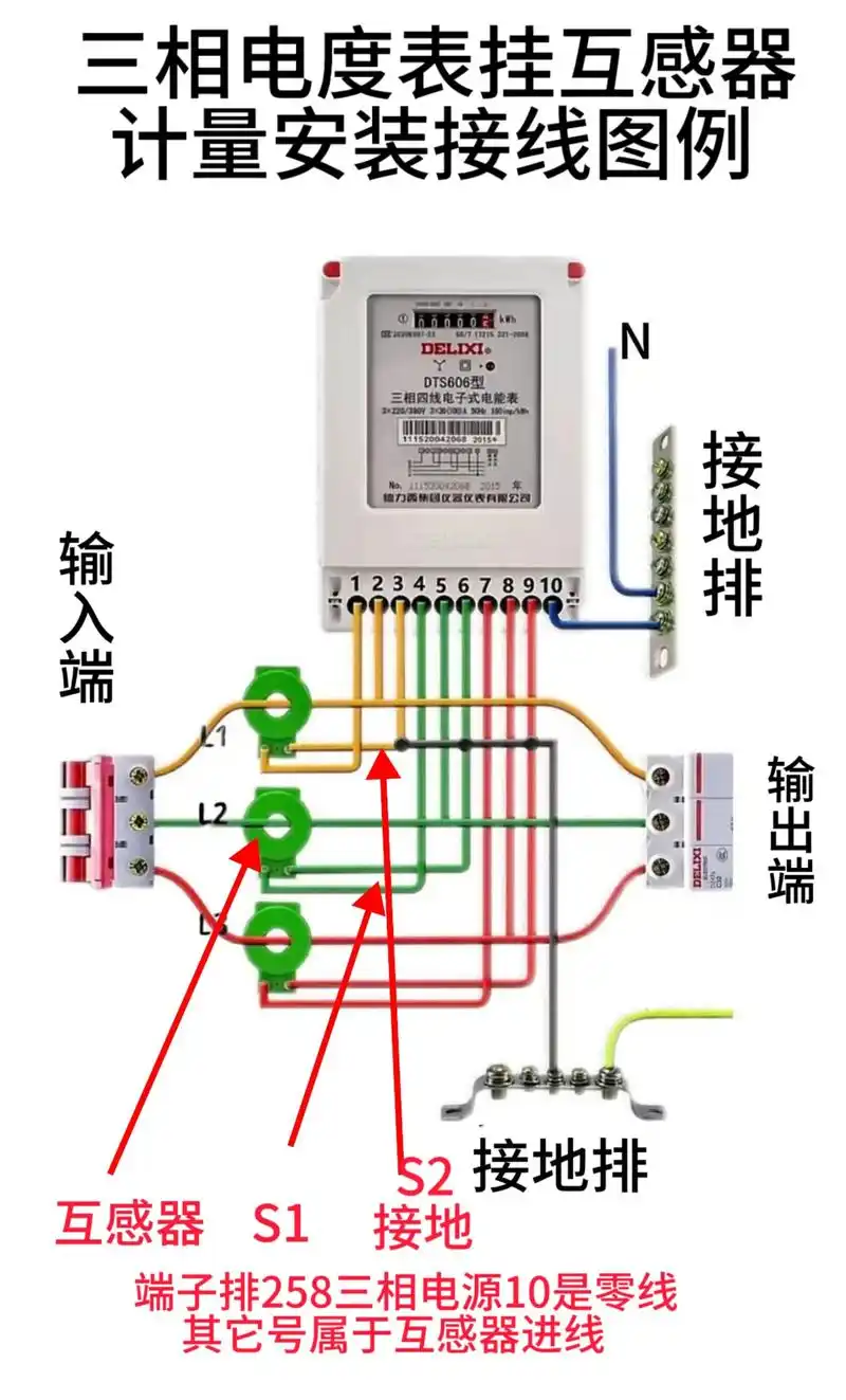 1.需借助电流互感器:三相火线(L1、L2、L3)先分别串联一台电流互感器的 “一次侧”(P1 进、P2 出),互感器 “二次侧”(S1、S2)再接入电表电流端子。